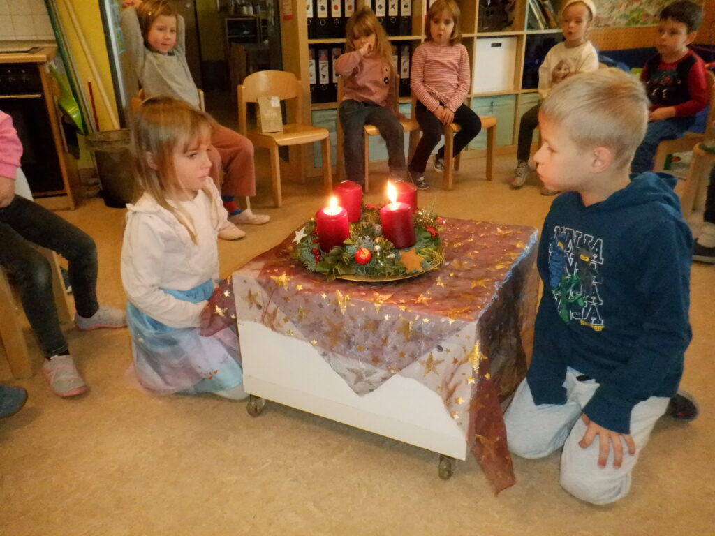 Der Dezember… Zeit der Heimlichkeiten, Zeit, sich auf das Weihnachtsfest vorzubereiten. Jeden Tag bernannte ein Stern in der Sternenkiste ein neues Adventskind, das im Morgenkeris das passende Tütchen vom Adventskalender nehmen durfte. Täglich begleitete uns unser Lied vom Adventskranz. Dieses gaben wir auch wieder, nach alter Tradition jeden Montag Morgen auf dem Kiga Parkplatz, für alle Eltern zum Besten. Natürlich besuchte uns auch der Nikolaus in der Kirche und brachte uns einen großen Sack voller Geschenke mit. Den feierlichen Abschluss bildete unsere kleine vorgezogene Weihnachtsfeier. Auch da gab es Geschenke für unsere Gruppe. Wir hörten die Weihnachtsgeschichte, durften eine weihnachtlichen Film gucken und ließen uns anschließend die Leckereien von unserem Brotzeitdosen Buffet schmecken. Bis 13 Uhr hatten wir dann noch Zeit, unsere Geschenke auszuprobieren. Gut gelaunt verabschiedeten wir uns in die Weihnachtsferien. Wir wünschen unseren Familien eine ruhige, besinnliche Weihnachtszeit und freuen uns auf ein Wiedersehen im neuen Jahr.